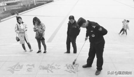 在山西大学商务学院的图书馆外,经常会看到一位保安在地砖上用水练字,配着方格状的地砖,俨然一副书法字帖的感觉,他就是该校的保安师傅刘福旭。